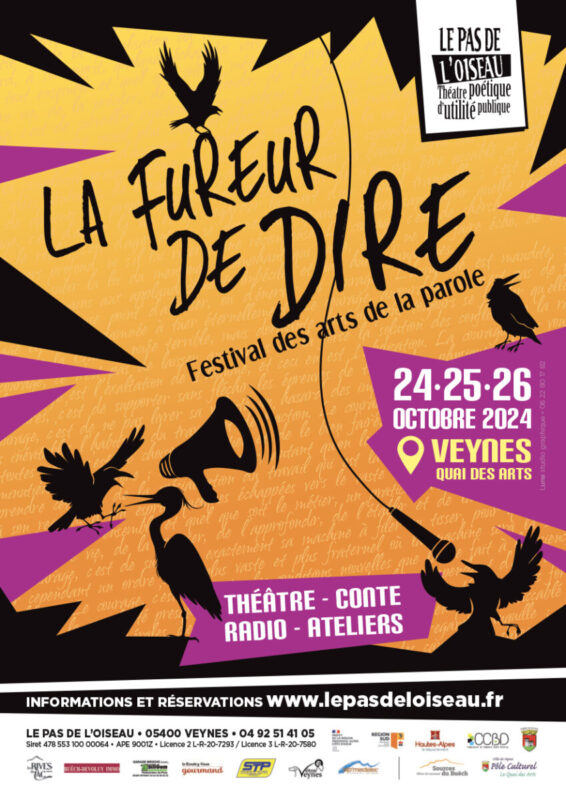Rassemblant la crème de la scène des arts du récit francophone, le festival La Fureur de Dire est événement qui repose sur l’exigence artistique et la coopération territoriale. Ce festival imaginé par Le pas de l’oiseau, se compose de théâtre, conte, émissions de radio, stages & ateliers. Toutes ces propositions culturelles sont liées par deux objets qui forment l’ADN du Pas de l‘oiseau : les Arts de la parole et le travail de territoire par l’éducation populaire.